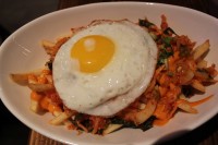 お酒のお伴におススメなのが、「キムチフライ」。かりかり揚げたてのフライドポテトの上にみじん切りのキムチとピリ辛マヨがたっぷりのっている。お好みで、トッピングに目玉焼きをのせることもできる。これをツマミに何杯でもお酒が飲めそうだ。