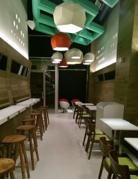 店内は、明るいトーンの木の壁で統一されており、天井は緑の牧草を幾何学的な格子で表現している。天井も高くとても広々とした空間だ。席数も124席とハンバーガーショップとしてはかなり大きい。