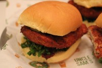 メニュー構成は、ハンバーガーとチキンサンドイッチ。ハンバーガーはシンプルな定番のハンバーガーとアジアンテイストがちりばめられたスペシャルバーガーの2種類。スペシャルバーガーでおススメの一品は、「Uncle Sam’s Signature Burger」。ソテーしたマッシュルーム、オイスターソース、スイスチーズ、ジューシーなお肉がバンズにはさまっている。